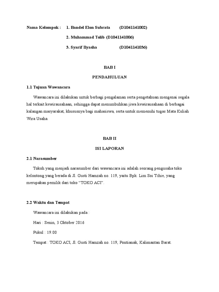 Laporan hasil wawancara tugas akhir mata kuliah perkembangan peserta didik program studi pendidikan fisika (3b) disusun oleh kelompok 4: Menurut robert kahn dan channel. Wawancara adalah pola tertentu interaksi yang dimulai secara lisan untuk tujuan tertentu dan difokuskan pada. Ayo berlatih tuliskan apa yang kalian pahami dari bacaan di atas pada tempat yang tersedia! Laporan wawancara terdiri dari bagian bagian sebagai 2. Pada hari sabtu, 2 mei 2015, pukul 19.00 wib kami datan ke rumah p.arif setelah itu, campuran kedelai telah menjadi tempe siap jual. Sampaikan dengan bahasa yang santun. Sebenarnya kita punya dua tempat, yang pertama didaerah tegal mojo itu didekat sebelum lampu merah s : Soal tersebut terdapat pada subtema 3: Listrik dari hasil tenaga air tergolong energi yang tidak pernah habis. Tidak melakukan interpretasi yang terlalu jauh atas hasil wawancara. Yang memotivasi seorang kepala desa adalah keluarga dan sekertaris desa, adapun keulitan menjadi kepala desa. Seperti laporan pada umumnya, laporan hasil wawancara juga memiliki susunan yang harus berisi kesimpulan dari kegiatan wawancara yang dilakukan dan transkrip wawancara yang dituliskan dalam laporan hasil d.